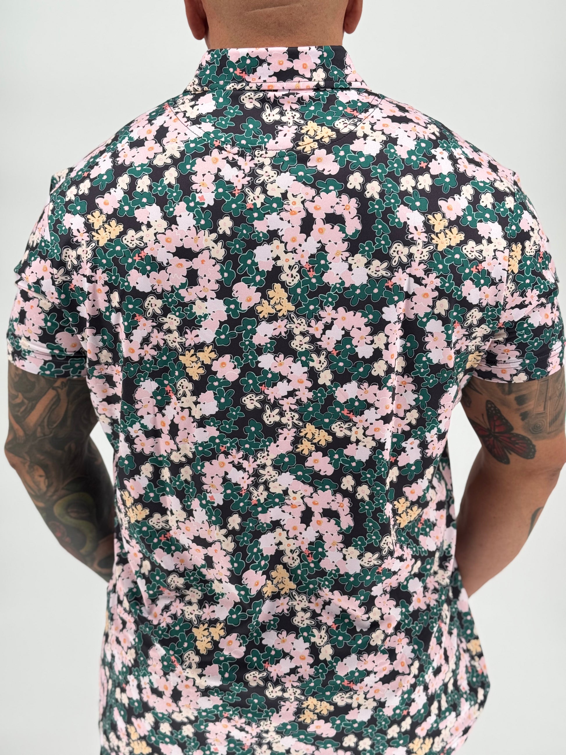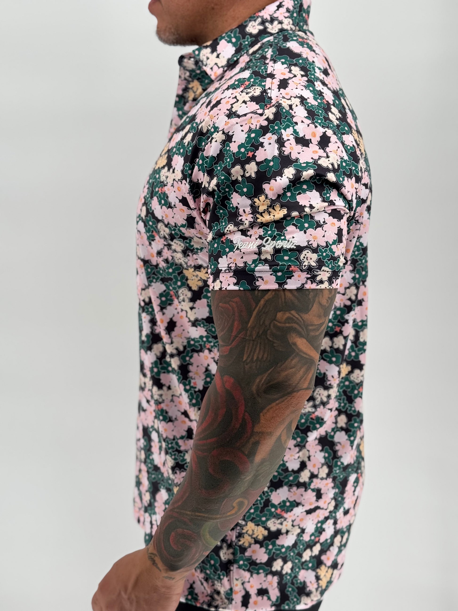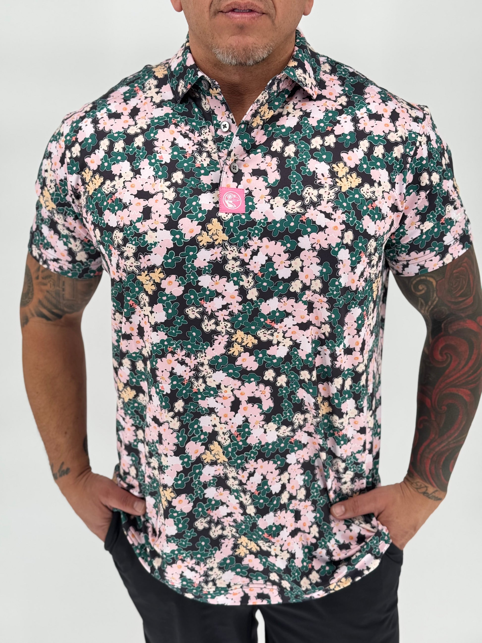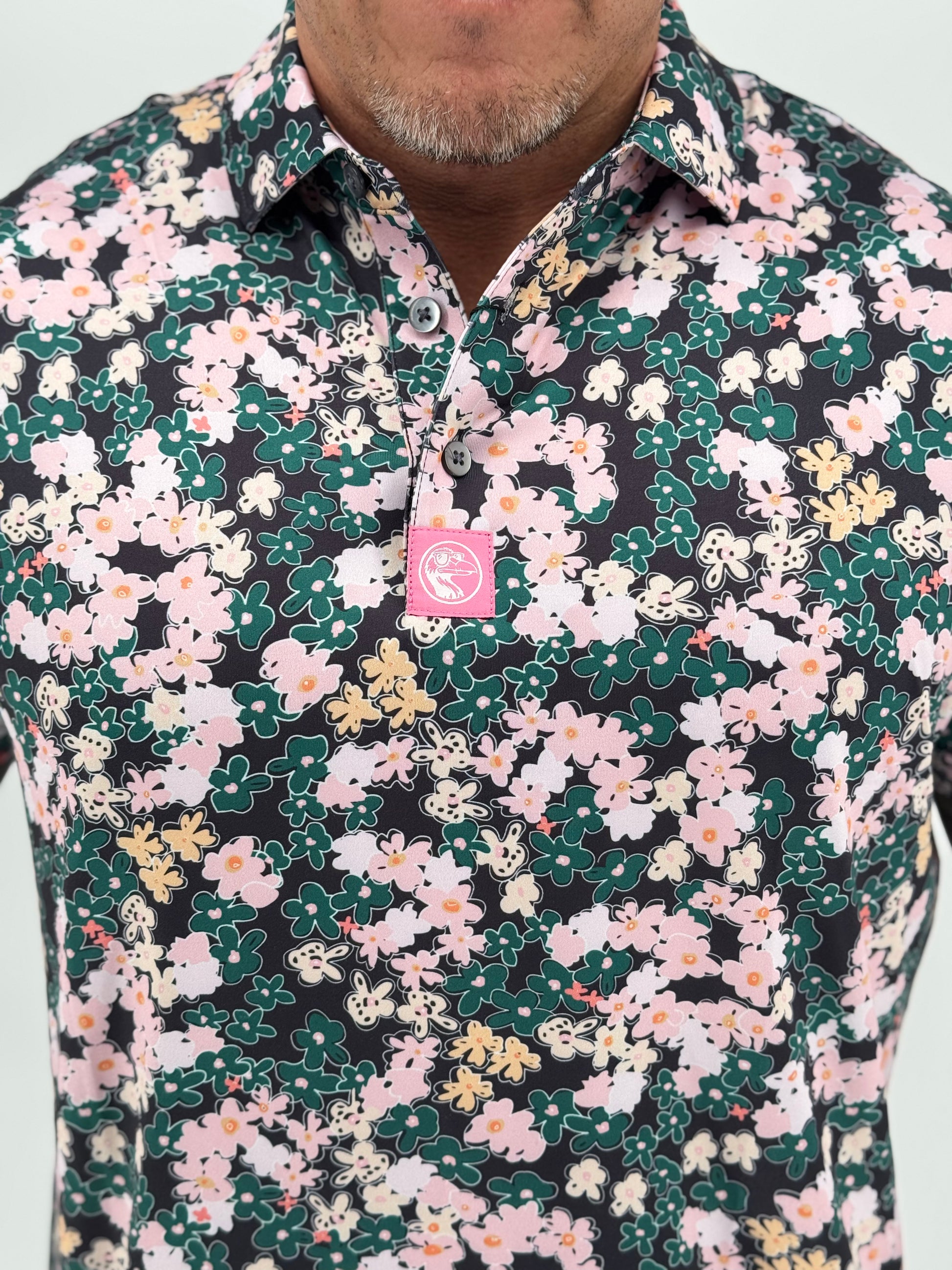 Why fade on the back nine when you can flower? The Back Nine Blooms Polo brings major energy from tee box to turn with its wild mix of blush pink blossoms, lush green leaves, and a garden-party attitude on a midnight base. Built with stretch-knit performance fabric and full-flower confidence, it’s ideal for golfers who don’t just chase birdies — they do it in full bloom. Warning: wearing this may result in unsolicited compliments and accidental twirls.