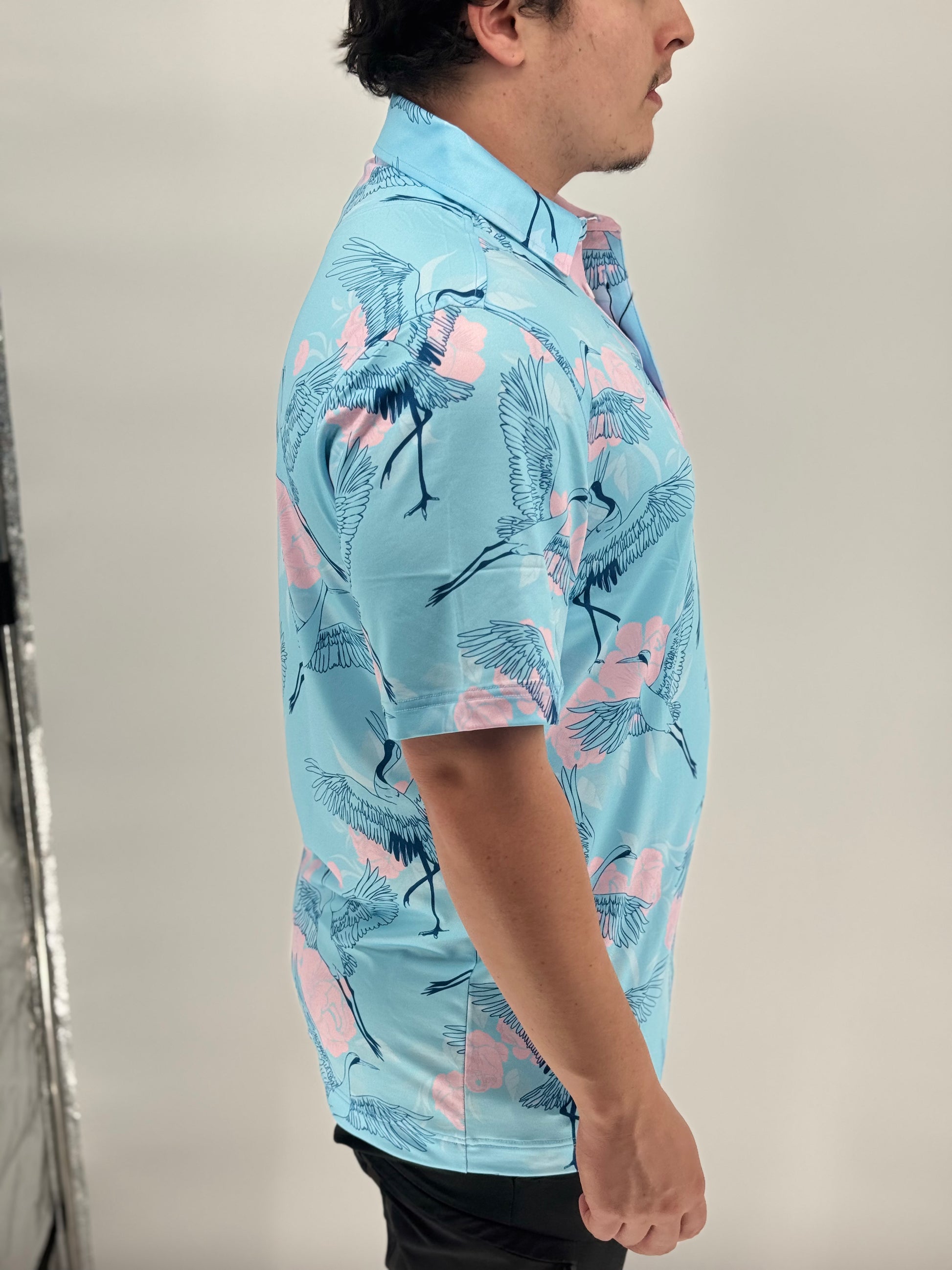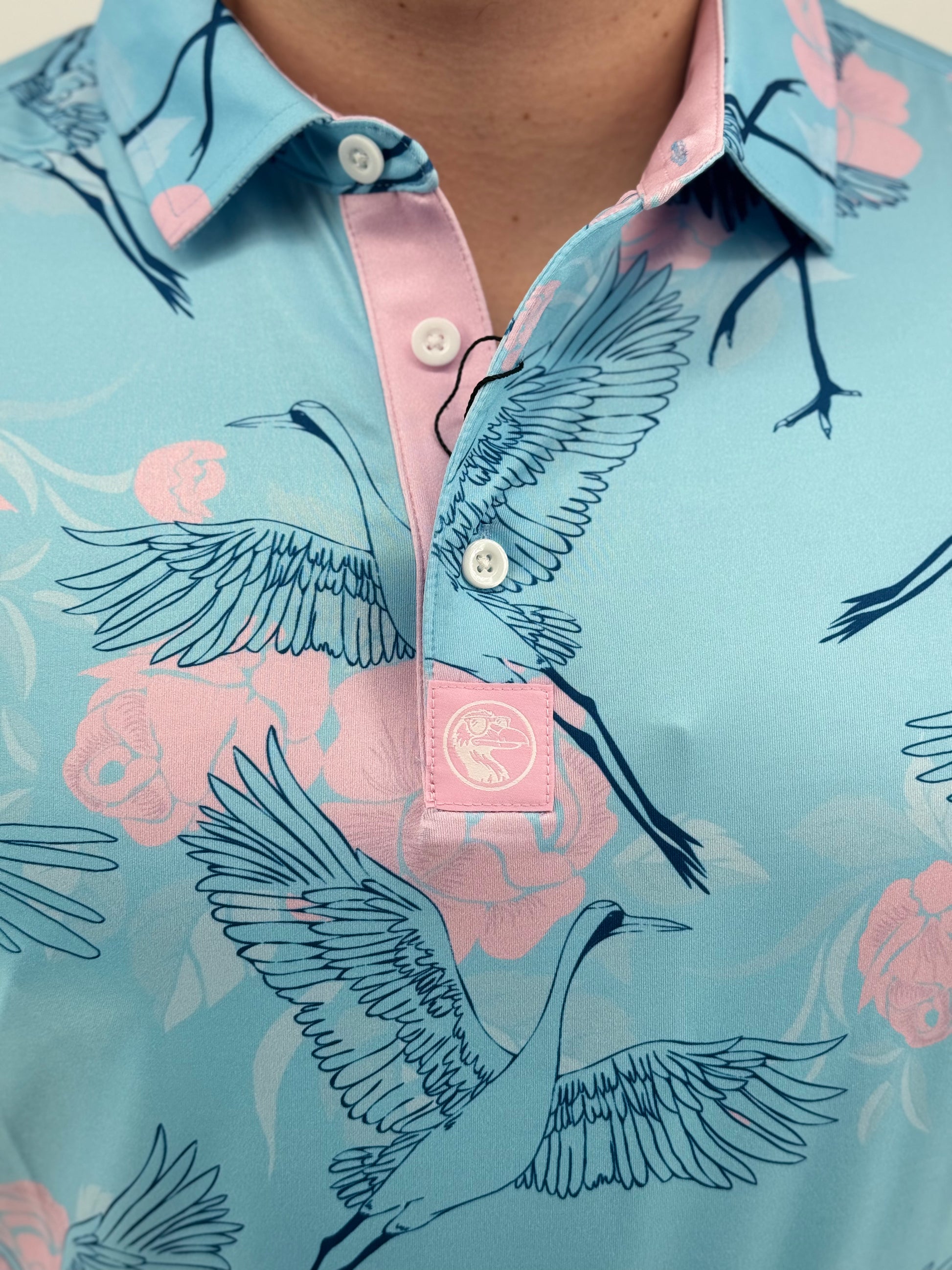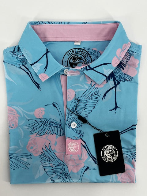 Soar above the standard with the Birds of Paradise Polo — a bold fusion of elegance and swagger. Set on a cool sky-blue canvas, graceful navy cranes glide through a field of delicate pink roses, creating a look that’s equal parts refined and fearless. With its soft pastel placket and breathable, stretch-friendly performance fabric, this polo brings smooth motion and smooth style from the first tee to the final toast. For the golfer who plays with grace — and a little flair.