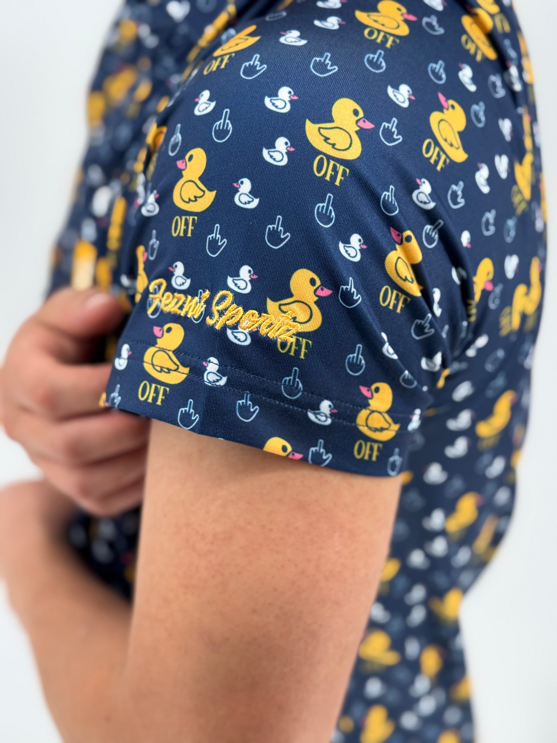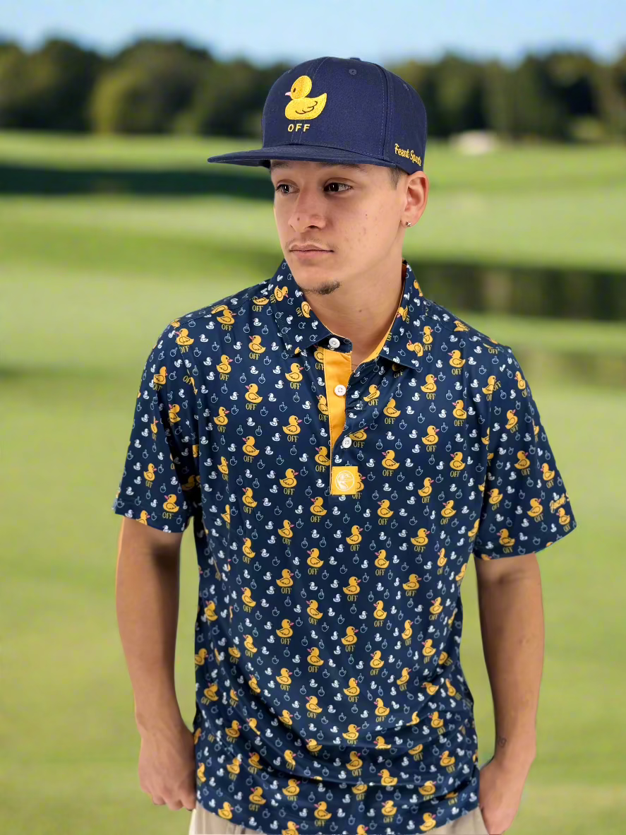 Crafted from a polyester blend for a lightweight, breathable feel with a relaxed fit, it’s built for course antics, cold ones, and confidently mediocre swings. If anyone says you suck at golf just tell them to, Duck off!