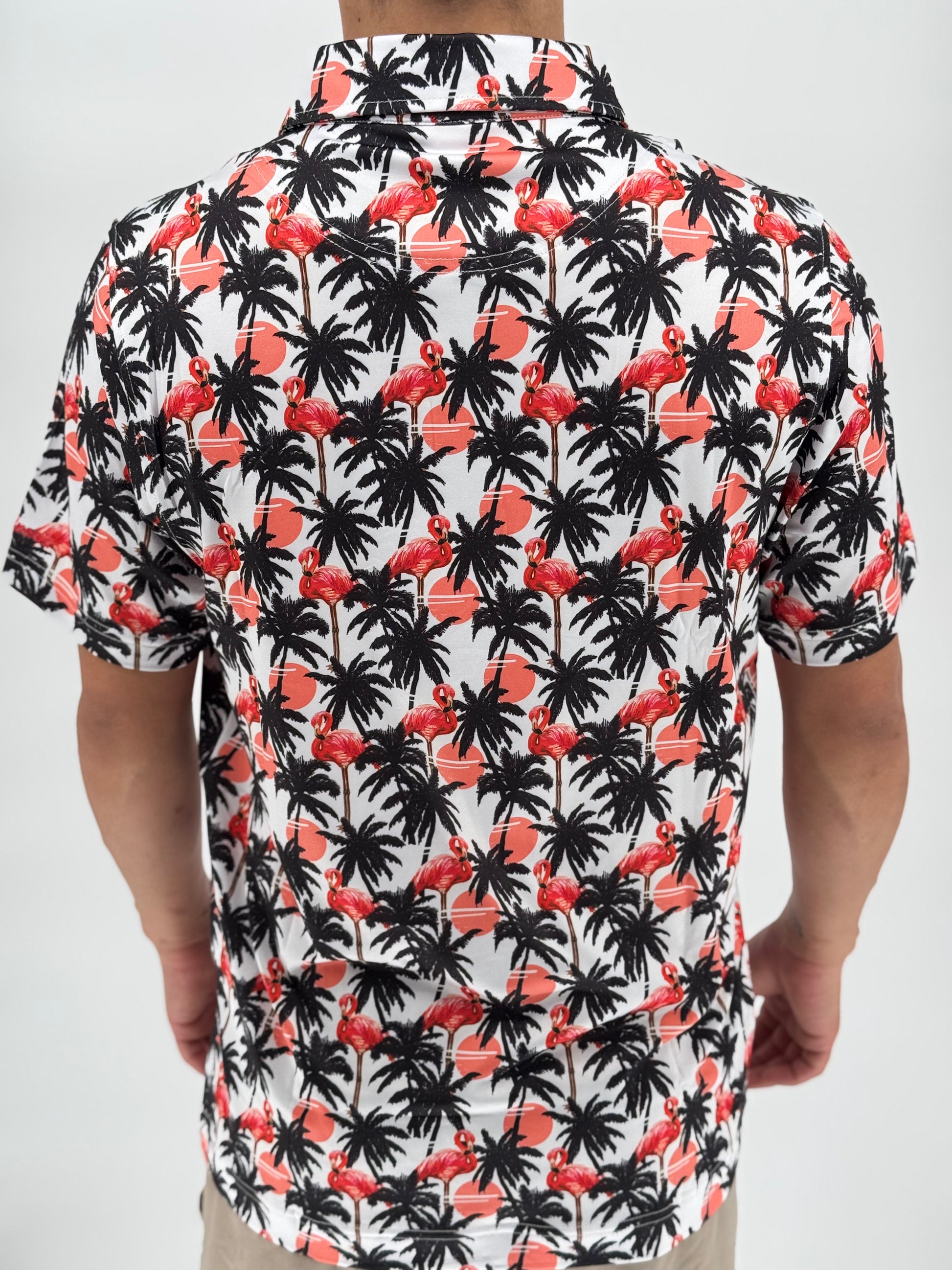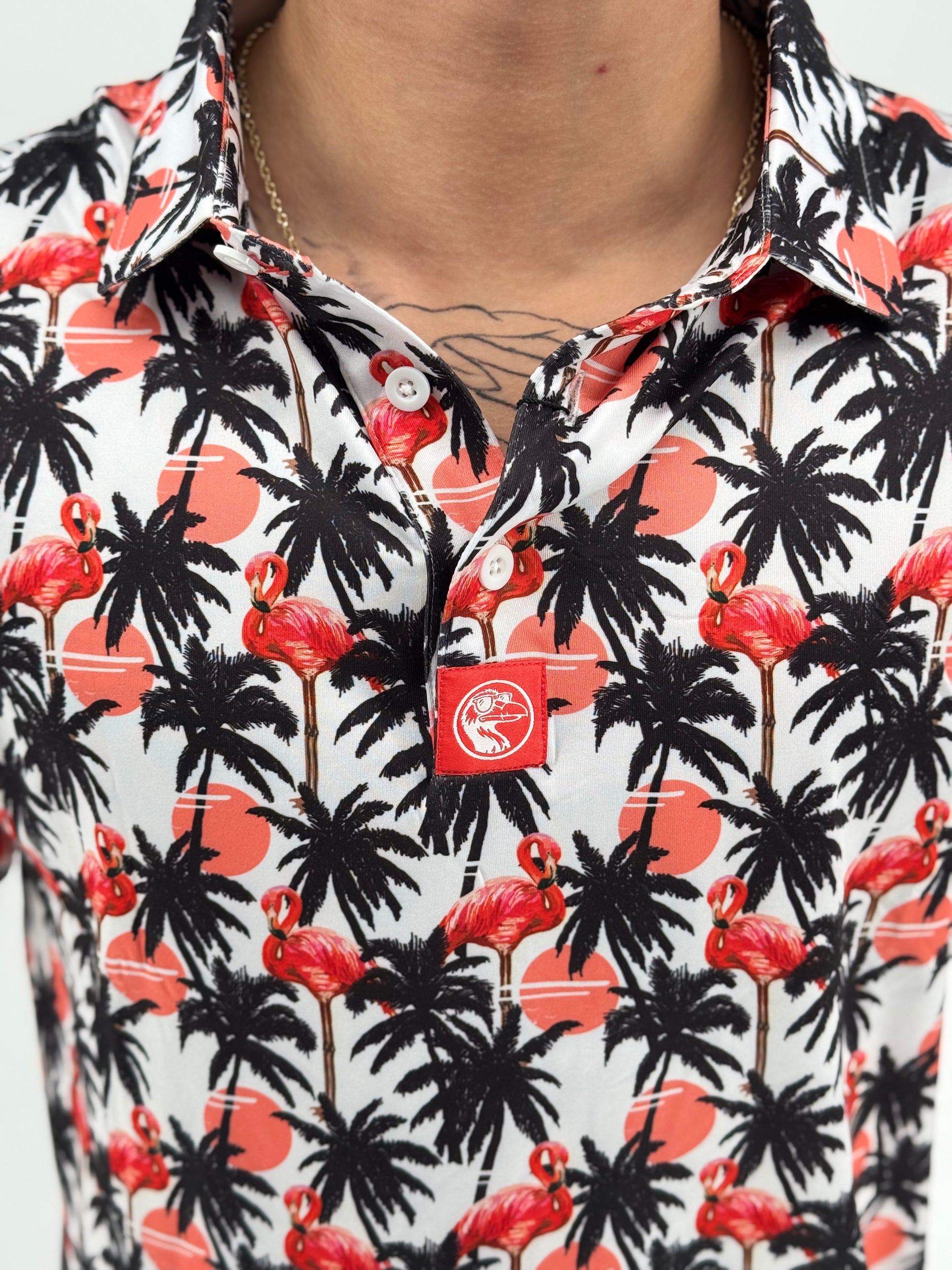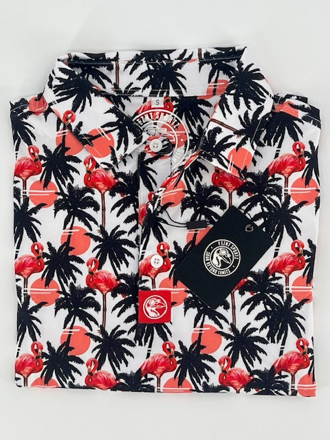 Turn up the tropical and let your swing strut with the Flamingle Polo. Covered in a wild mix of pink flamingos, palm silhouettes, and retro sunset pops, this shirt brings serious island heat to your course look. Whether you're hitting fairways or just vibing with the crew, moisture-wicking performance fabric and stretch-ready comfort keep you cool while your fit does the talking. Perfect for those who play bold, dress bolder, and never birdie alone.