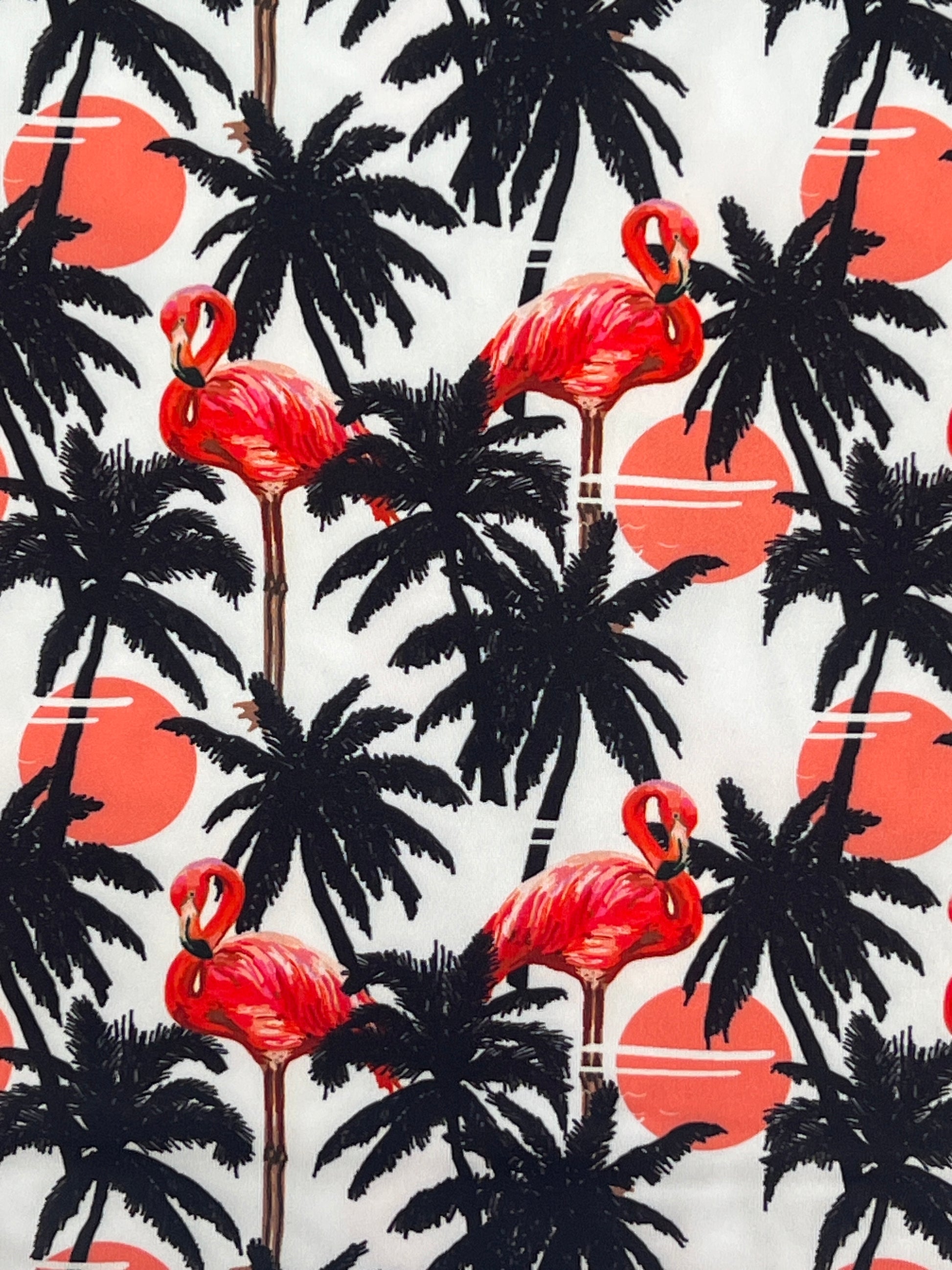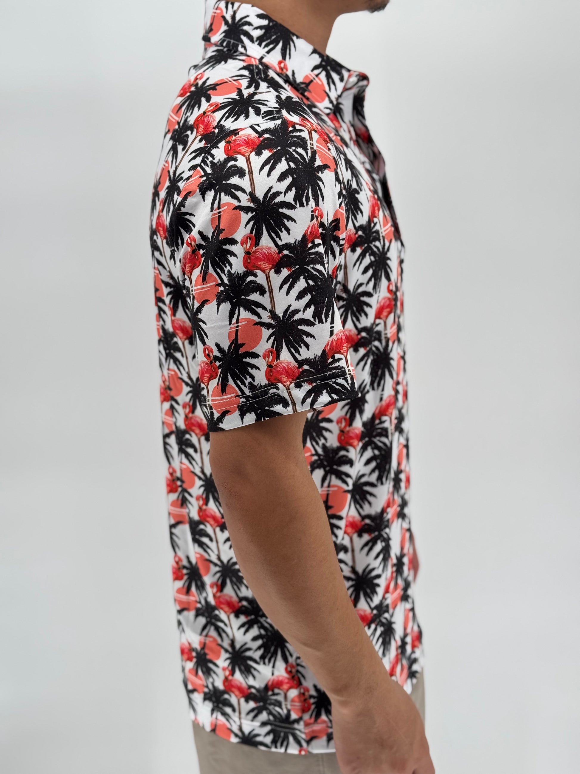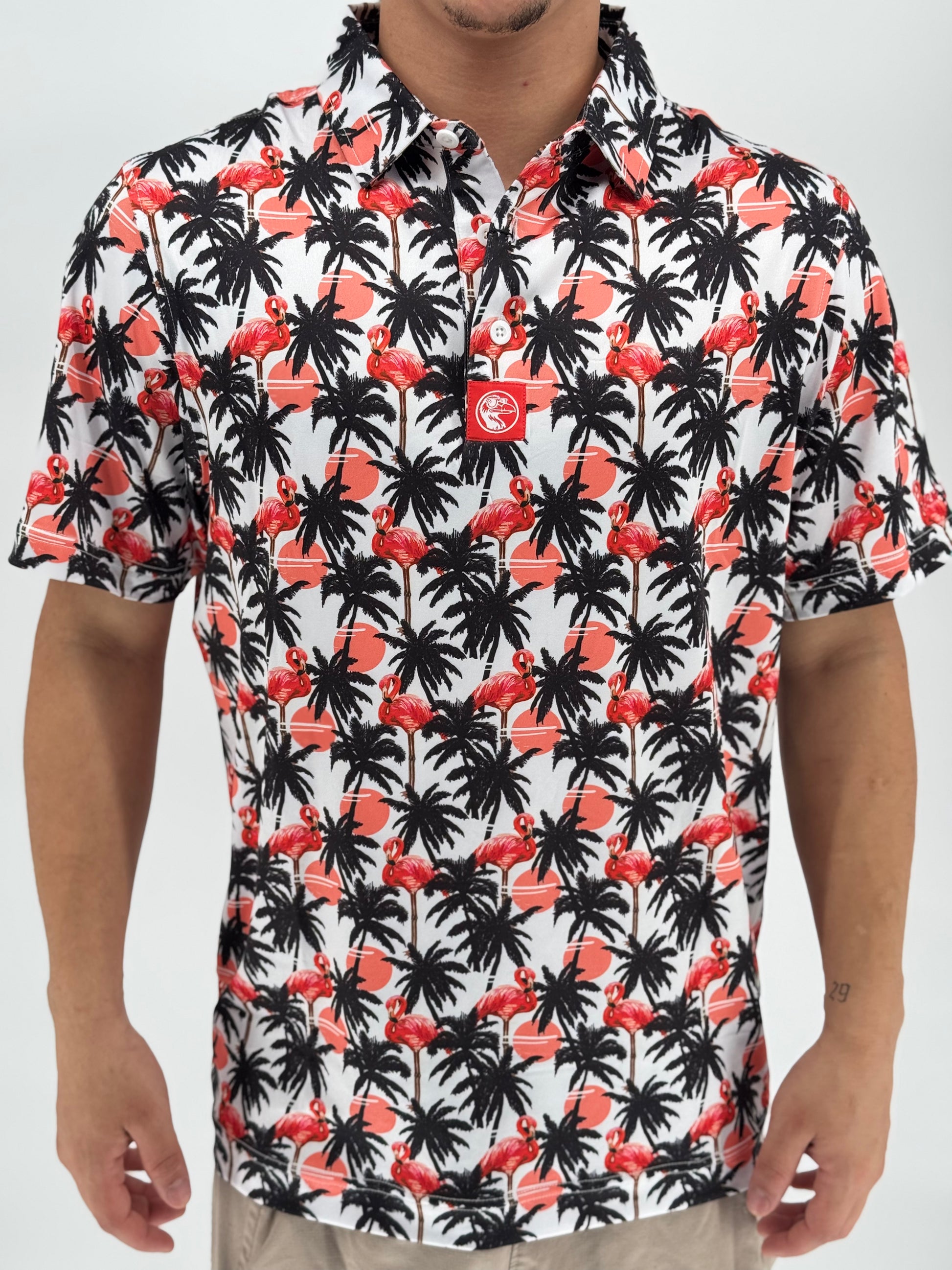 Turn up the tropical and let your swing strut with the Flamingle Polo. Covered in a wild mix of pink flamingos, palm silhouettes, and retro sunset pops, this shirt brings serious island heat to your course look. Whether you're hitting fairways or just vibing with the crew, moisture-wicking performance fabric and stretch-ready comfort keep you cool while your fit does the talking. Perfect for those who play bold, dress bolder, and never birdie alone.