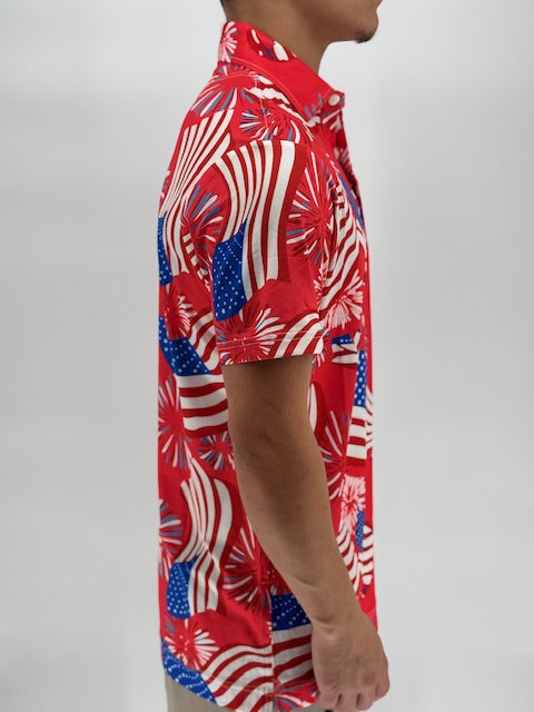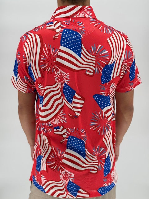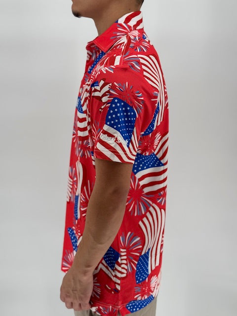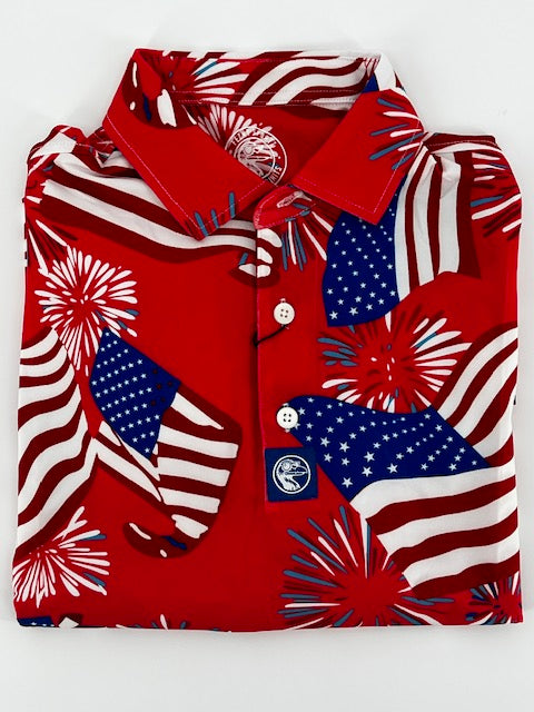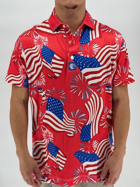 Freedom Swing is what happens when the stars align, the beers are cold, and the tee box becomes a launch pad. Draped in red, white, and blue with fireworks and flags exploding across the fabric, this polo doesn’t whisper patriotism—it yells it mid-backswing.