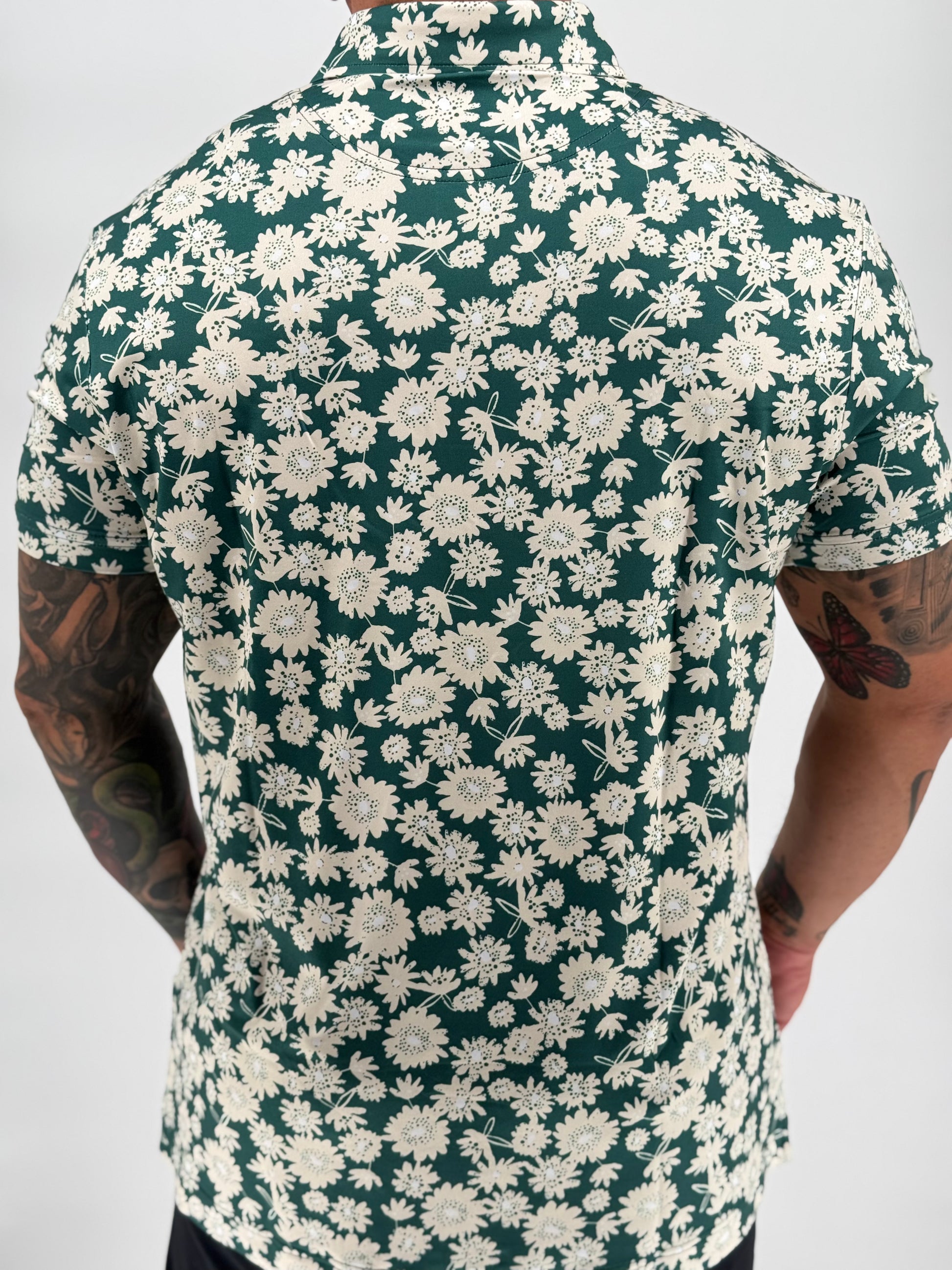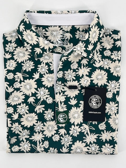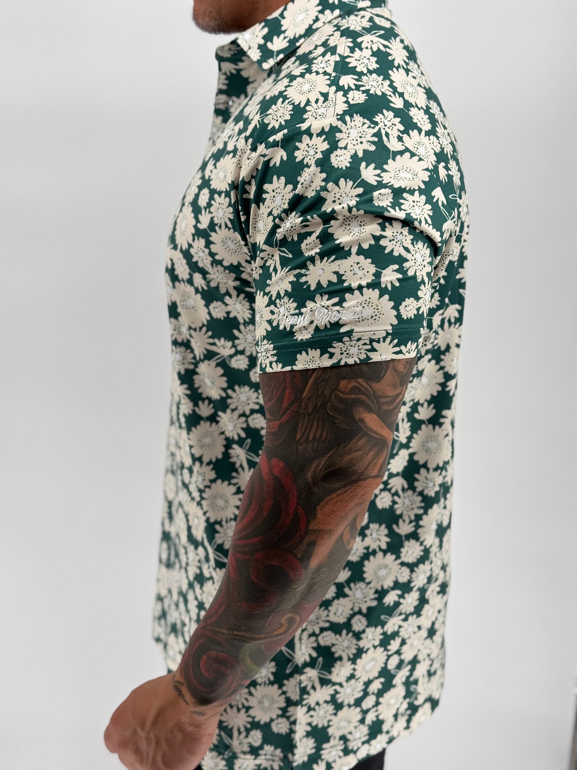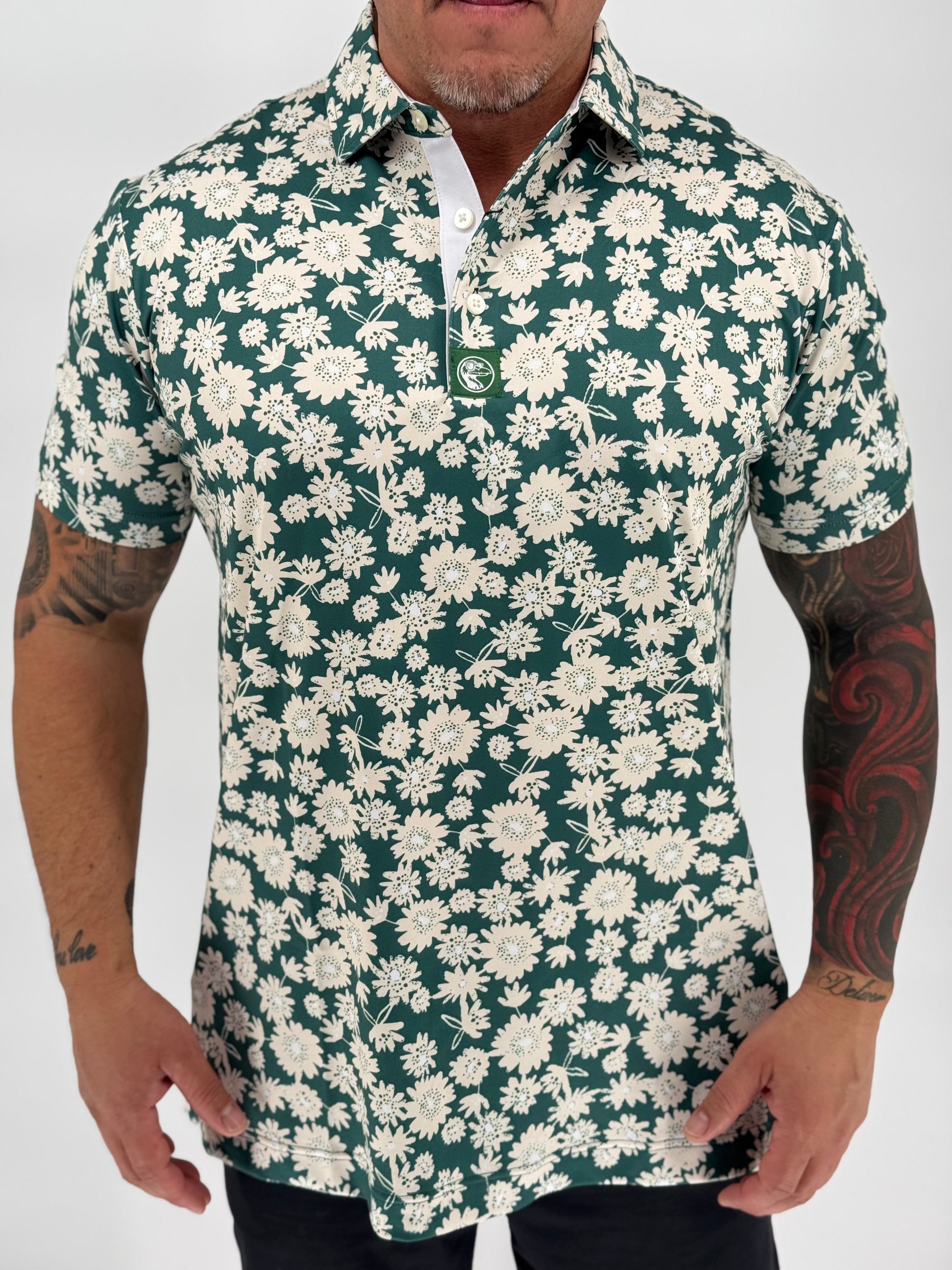 Bring the course to full bloom in the Greenhouse Effect Polo — a bold floral statement rooted in comfort and performance. With a deep forest green background and a garden of soft ivory blossoms, this polo balances natural charm with serious style. Designed with lightweight, moisture-wicking fabric and just the right stretch, it's made to keep you cool while your swing heats up. From tee time to happy hour, this shirt grows on everyone.
