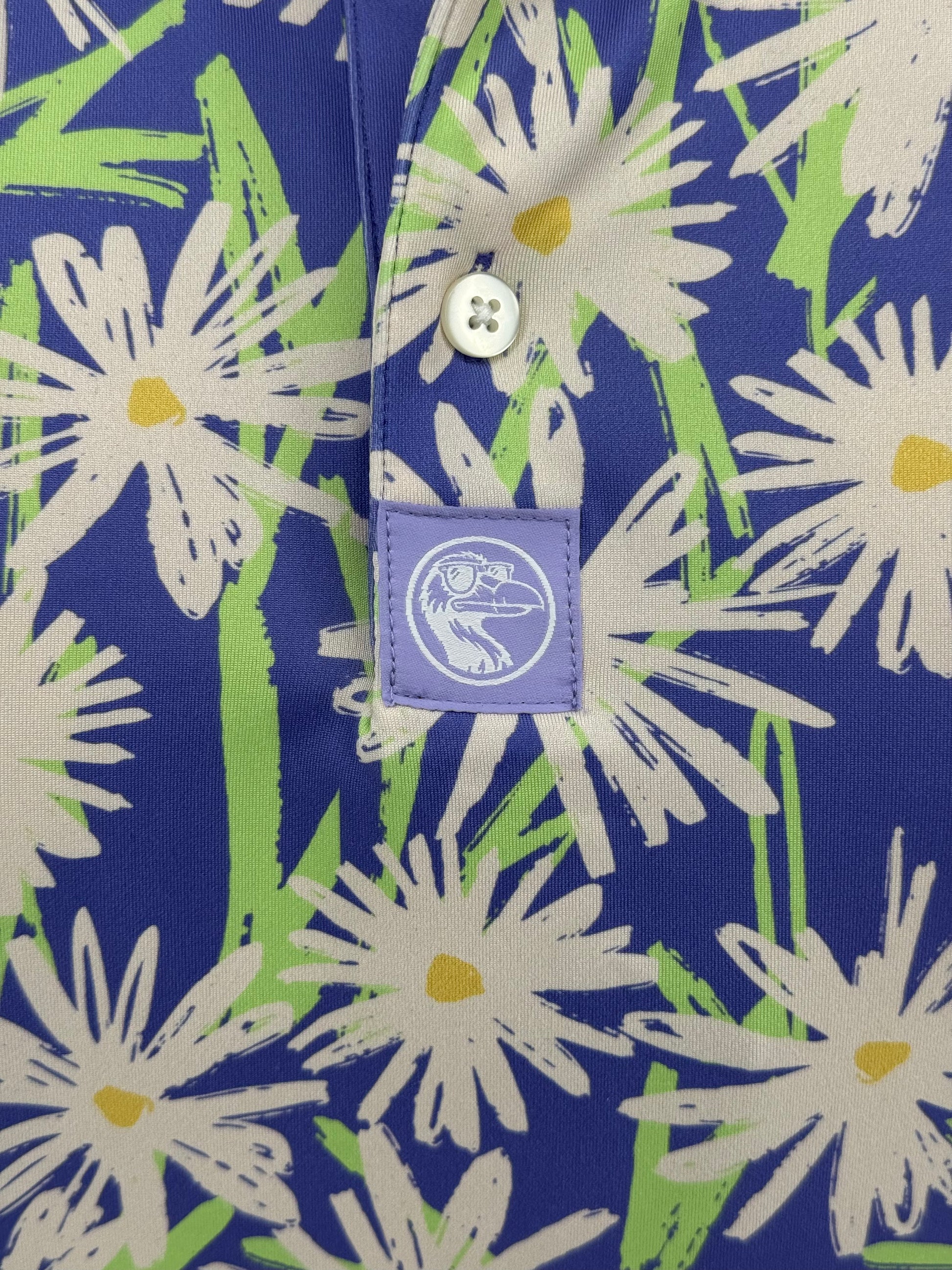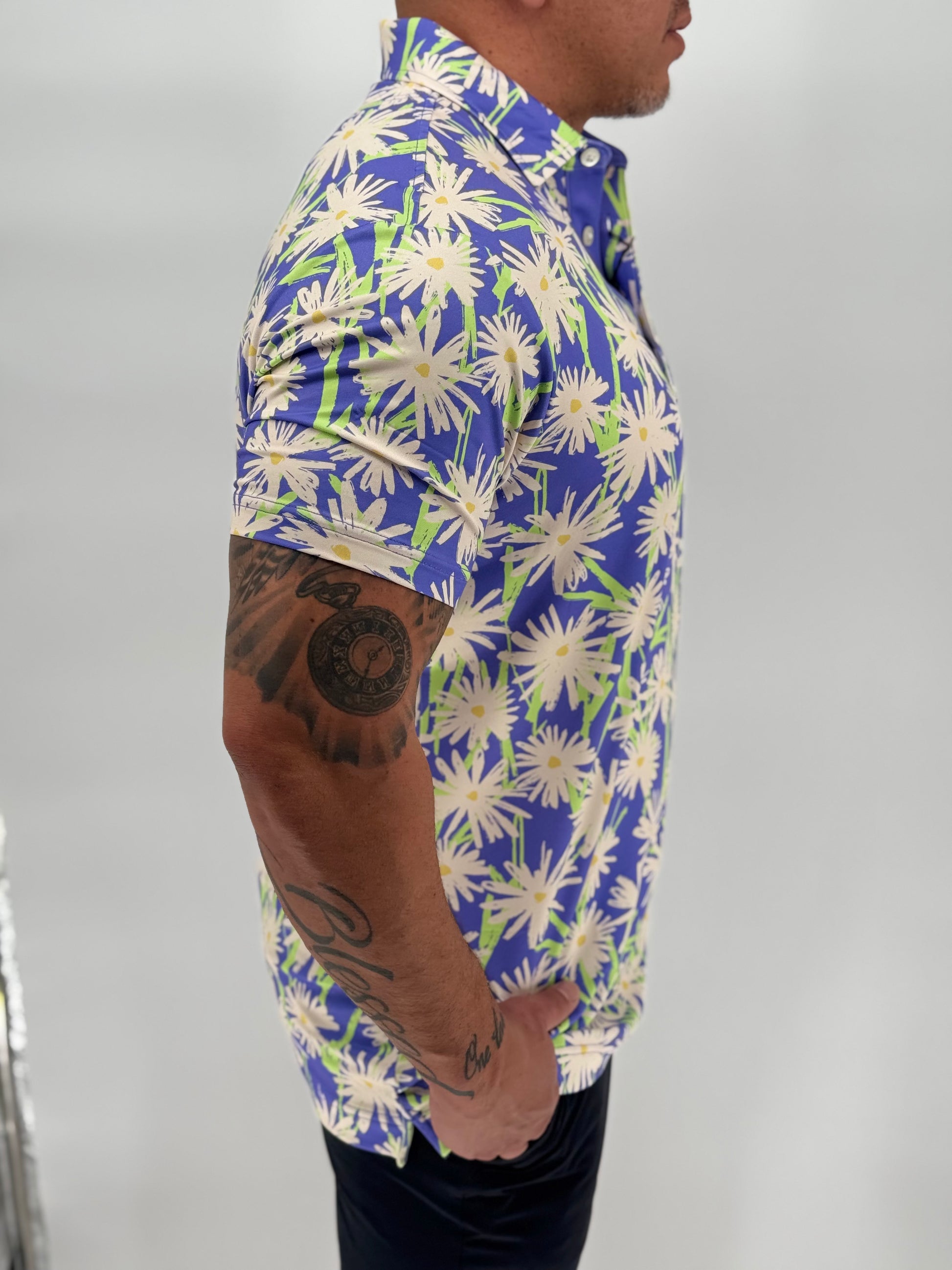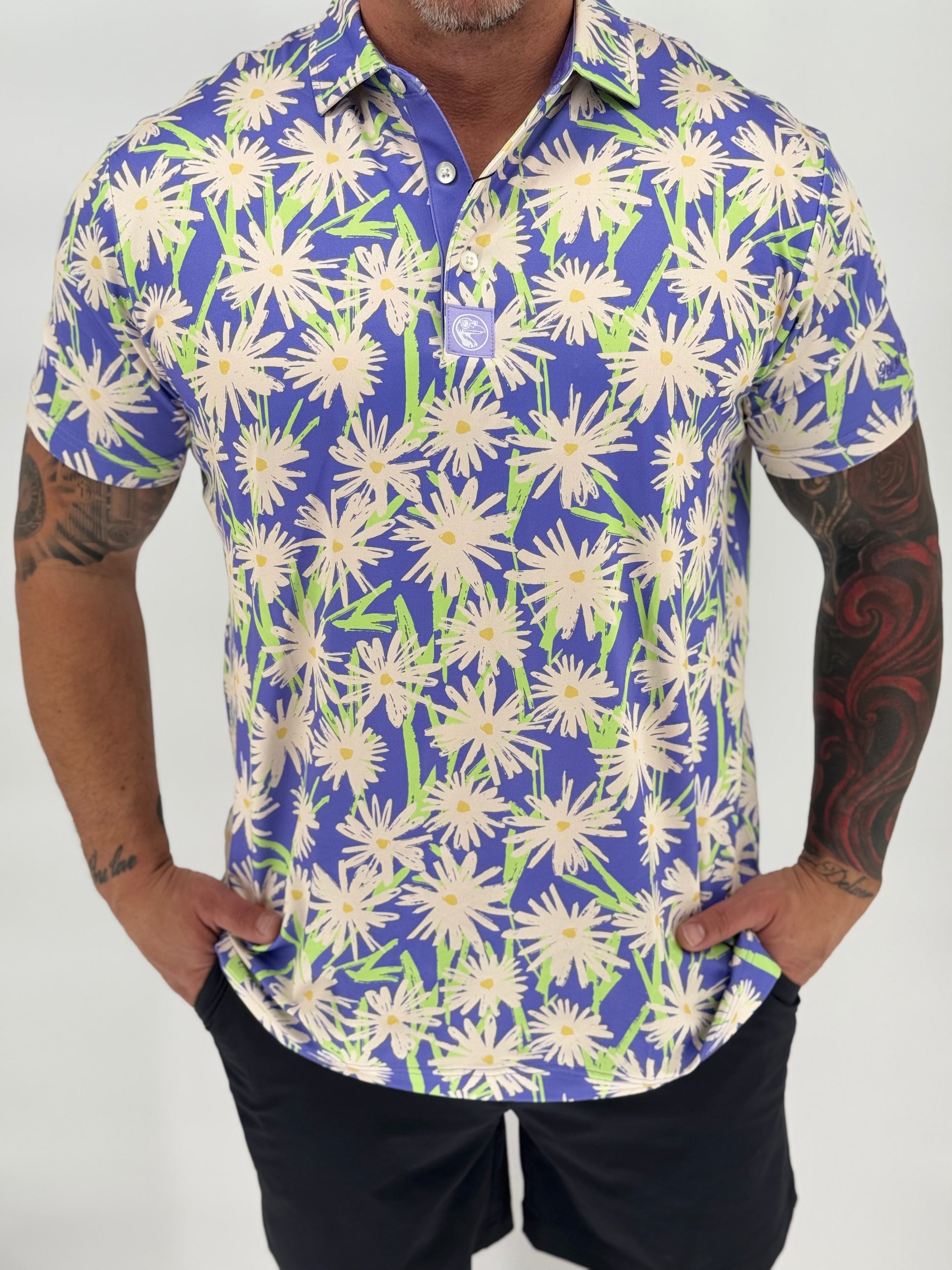“Night Bloom” is what happens when twilight swagger meets tropical cool. Drenched in deep purple-blue and bursting with sharp white floral prints, this polo is made for the player who brings vacation energy to every swing. Whether you’re chasing birdies or just flexing in the fairway, this shirt lets your style bloom even when your scorecard doesn’t.