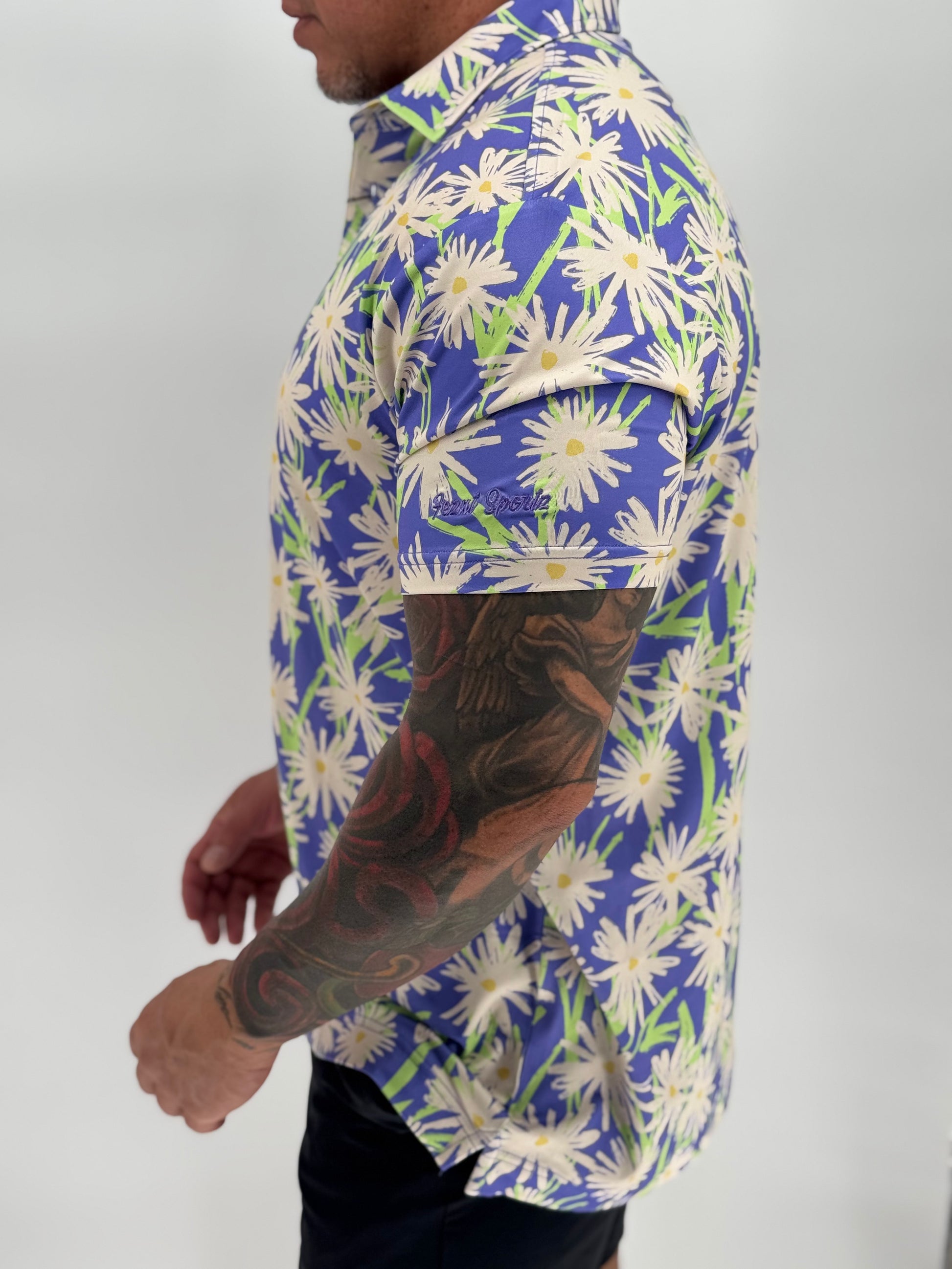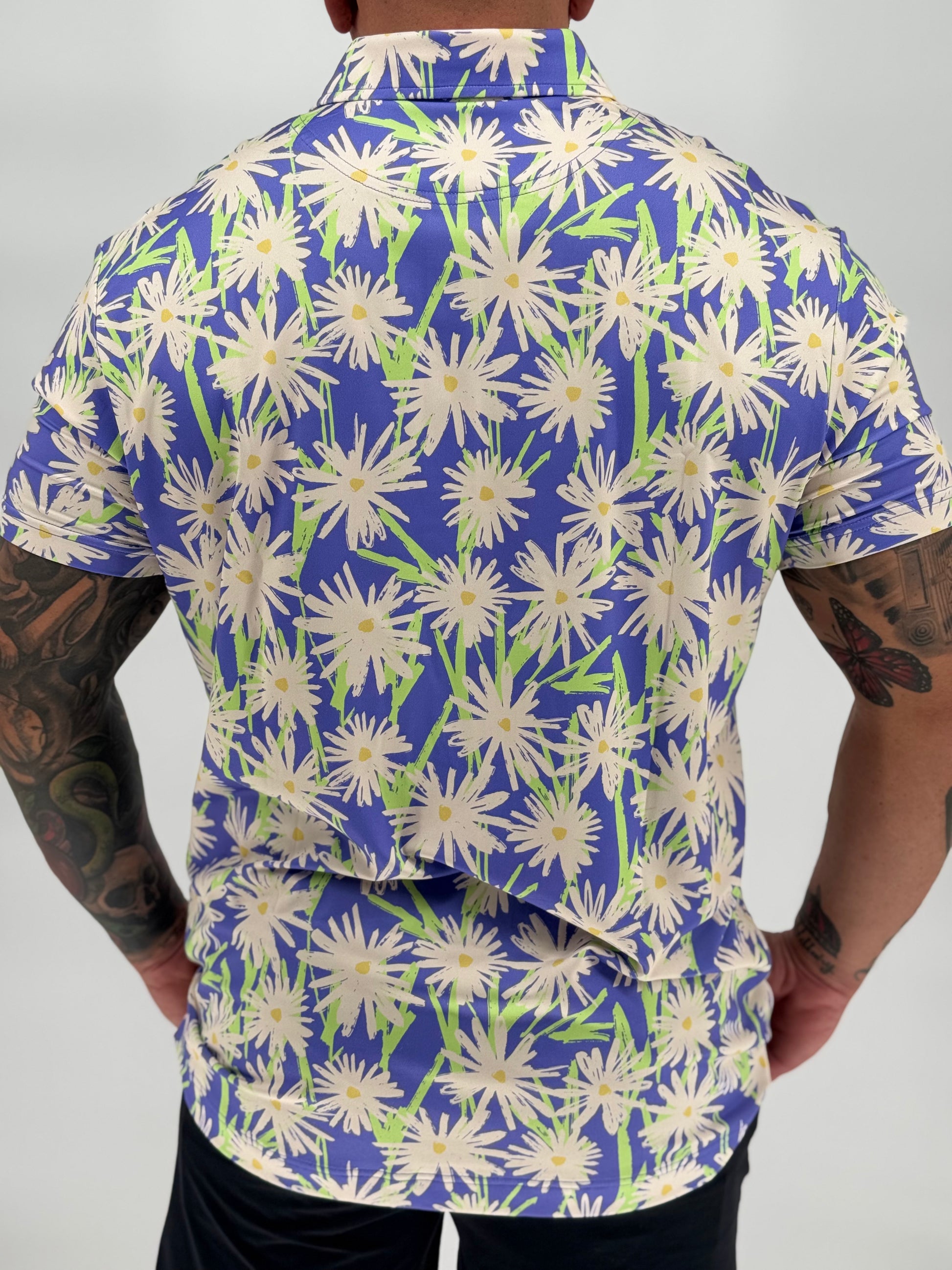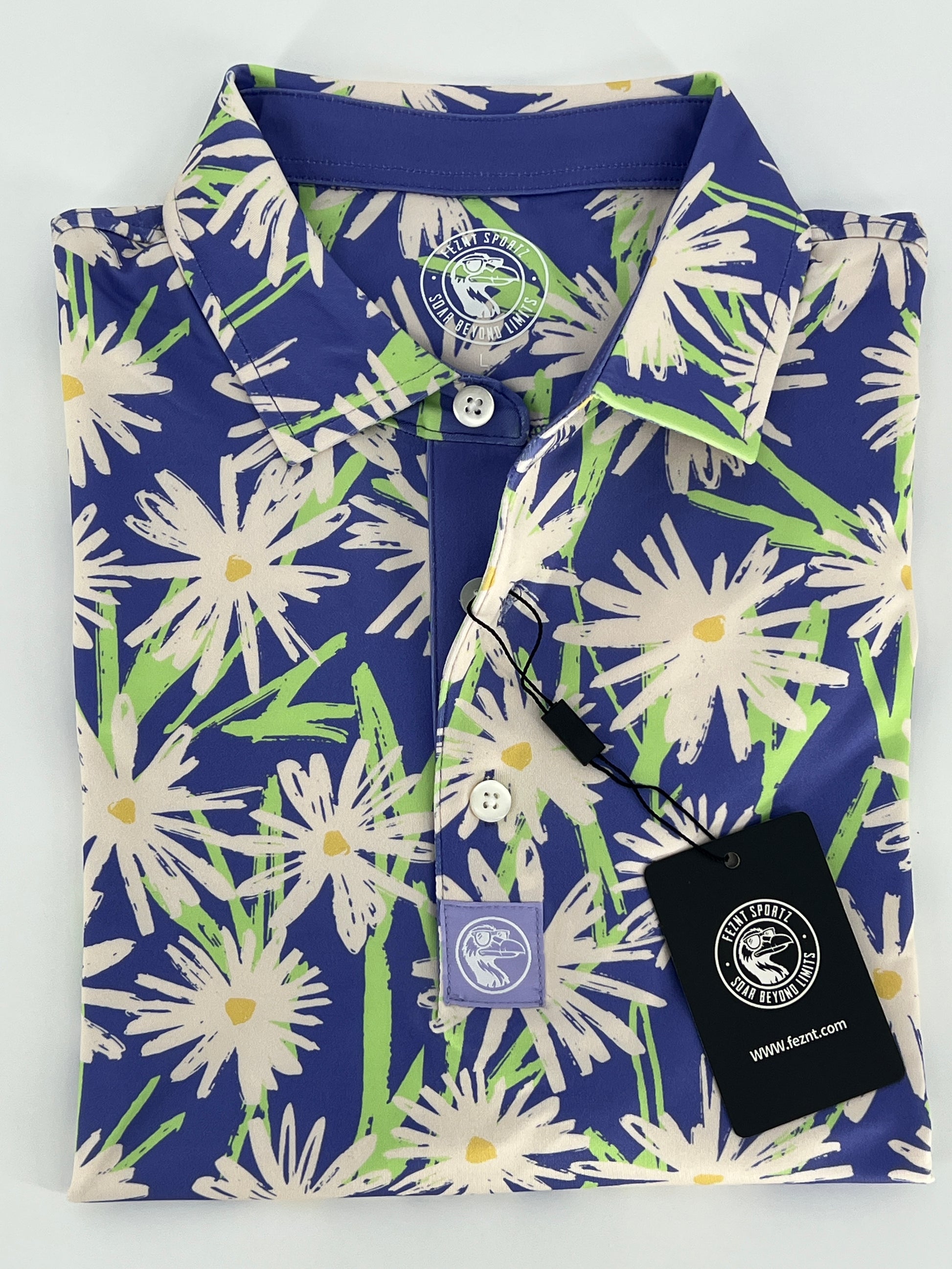 “Night Bloom” is what happens when twilight swagger meets tropical cool. Drenched in deep purple-blue and bursting with sharp white floral prints, this polo is made for the player who brings vacation energy to every swing. Whether you’re chasing birdies or just flexing in the fairway, this shirt lets your style bloom even when your scorecard doesn’t.