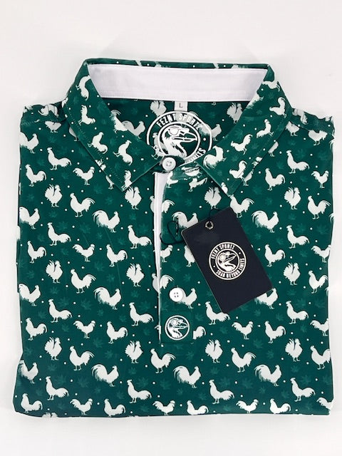 Bold, loud, and unapologetically off-par, El Gallo brings roosters, reefer, and relentless swagger to the green. This emerald-hued polo is feathered with cocky roosters and crowned in a blaze of marijuana leaves—because subtlety never won a skins match.