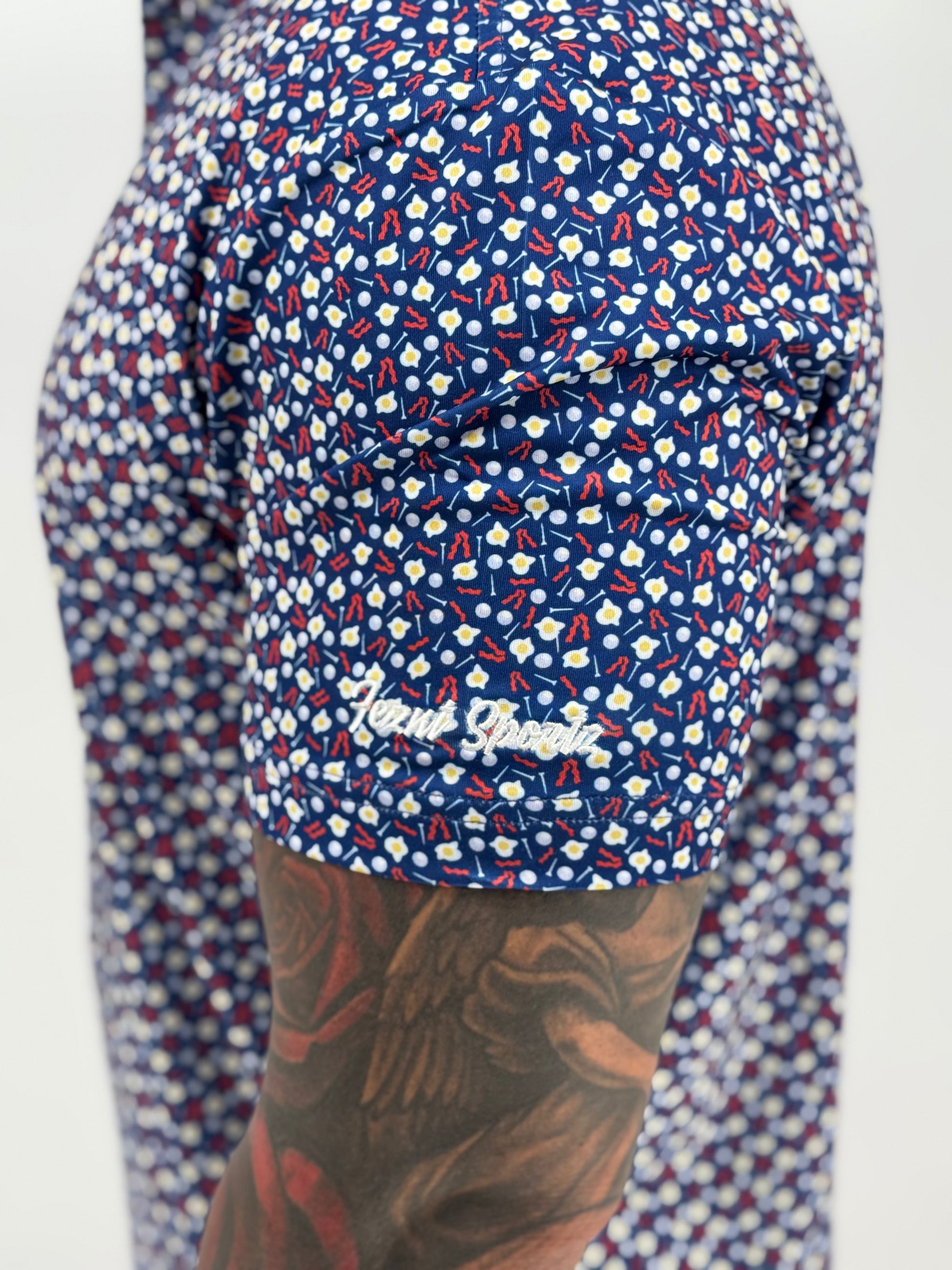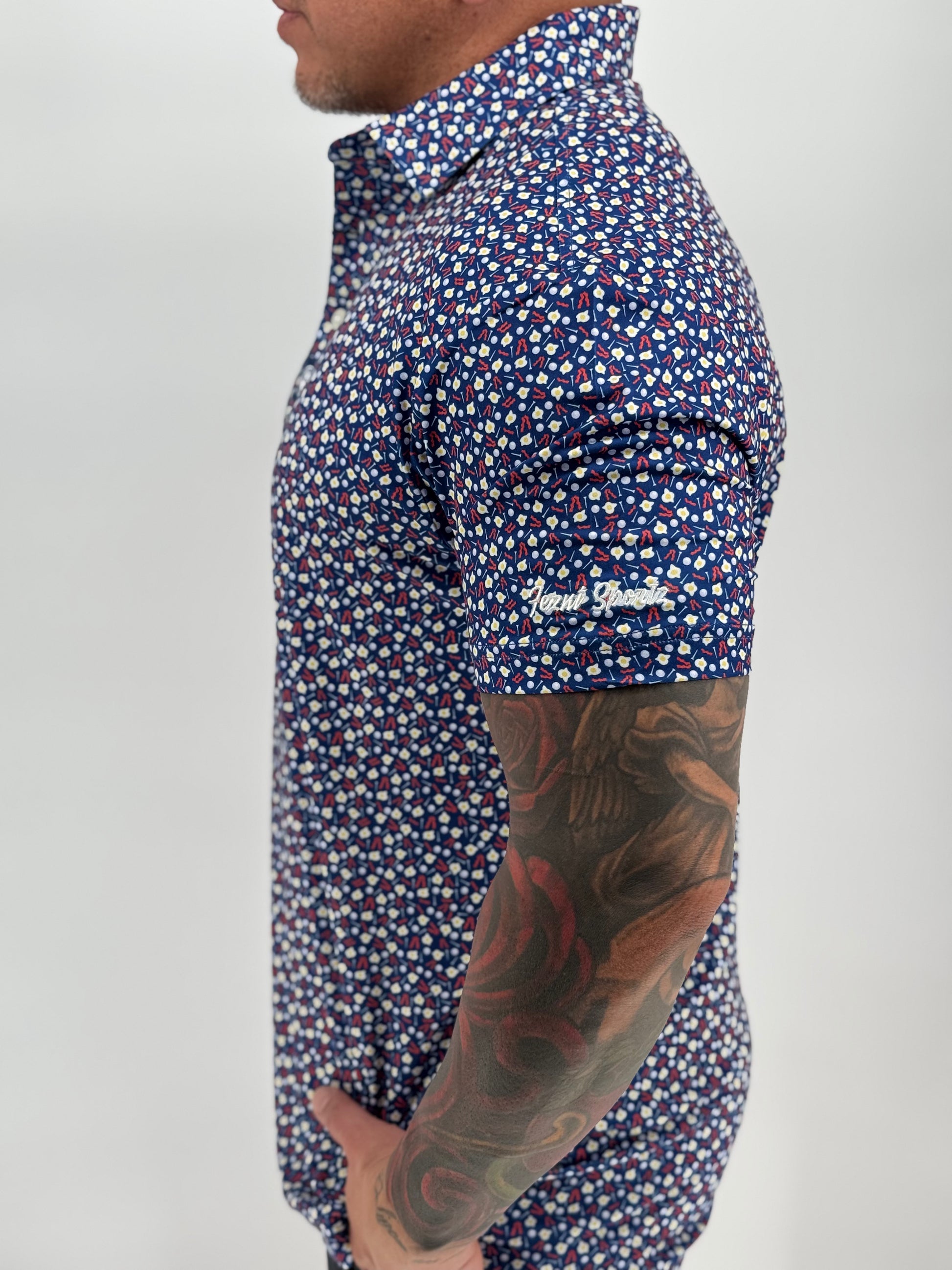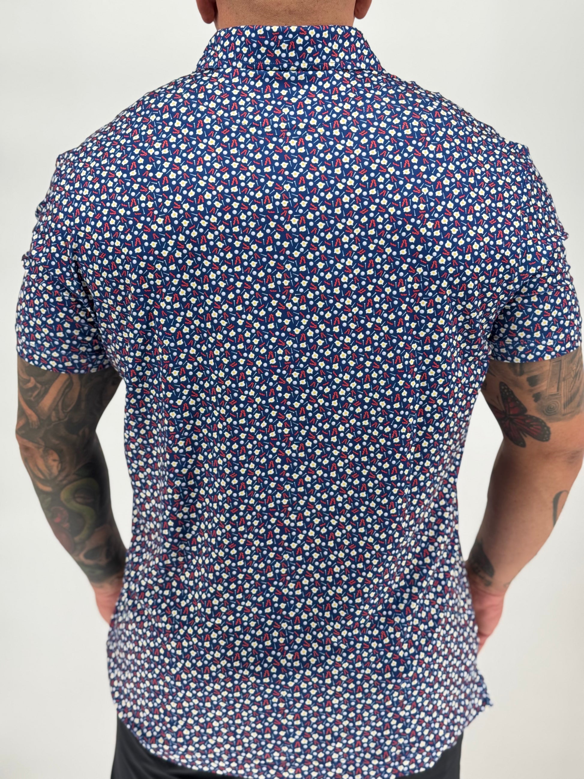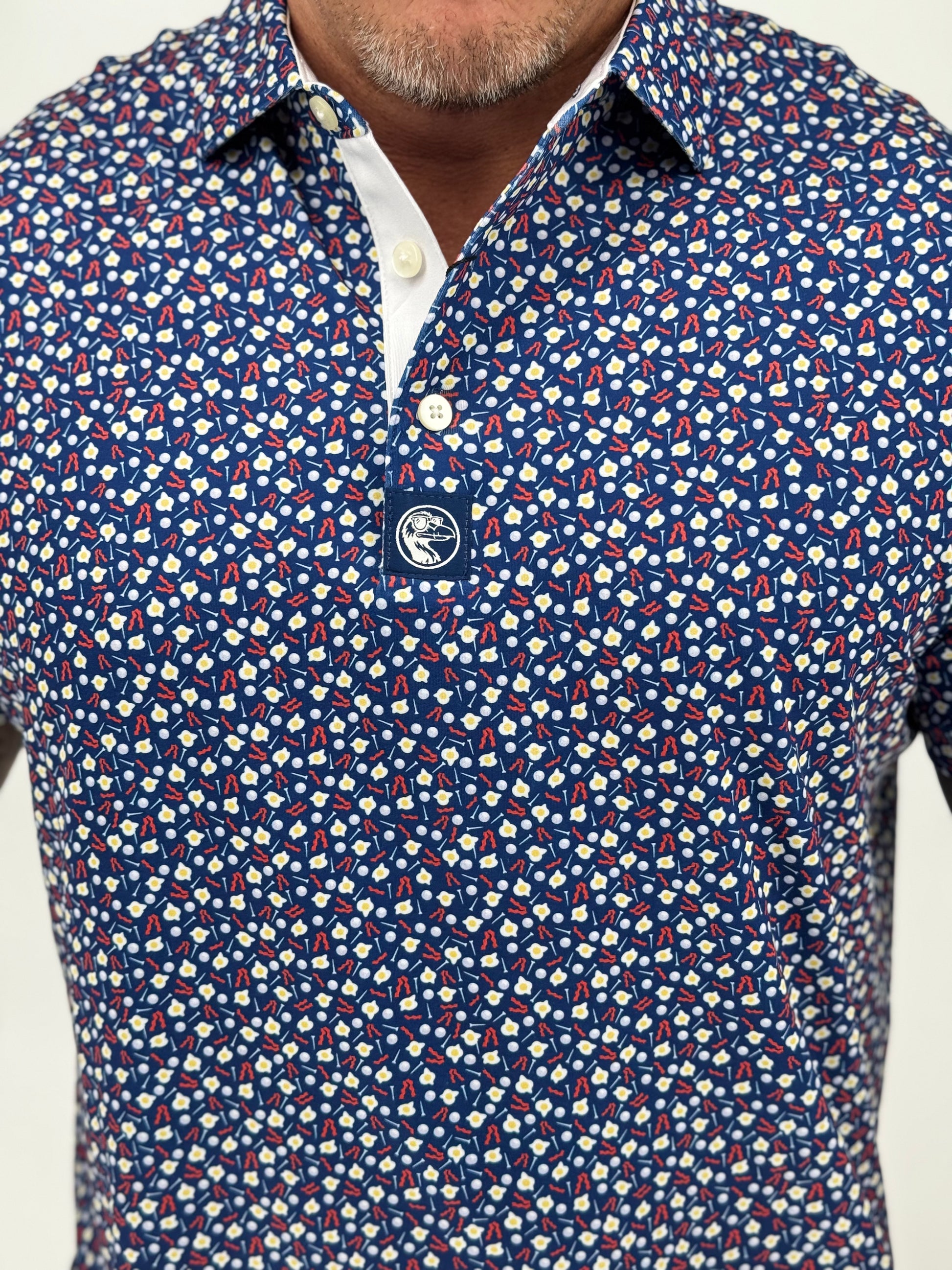Rise, shine, and swing in style—The Over Easy is the only polo cooked up for champions of the second tee-off. Served hot with sizzling strips of bacon, sunny-side eggs, and scattered golf balls and tees, this polo is a tribute to morning rounds, mulligans, and unapologetic indulgence.
