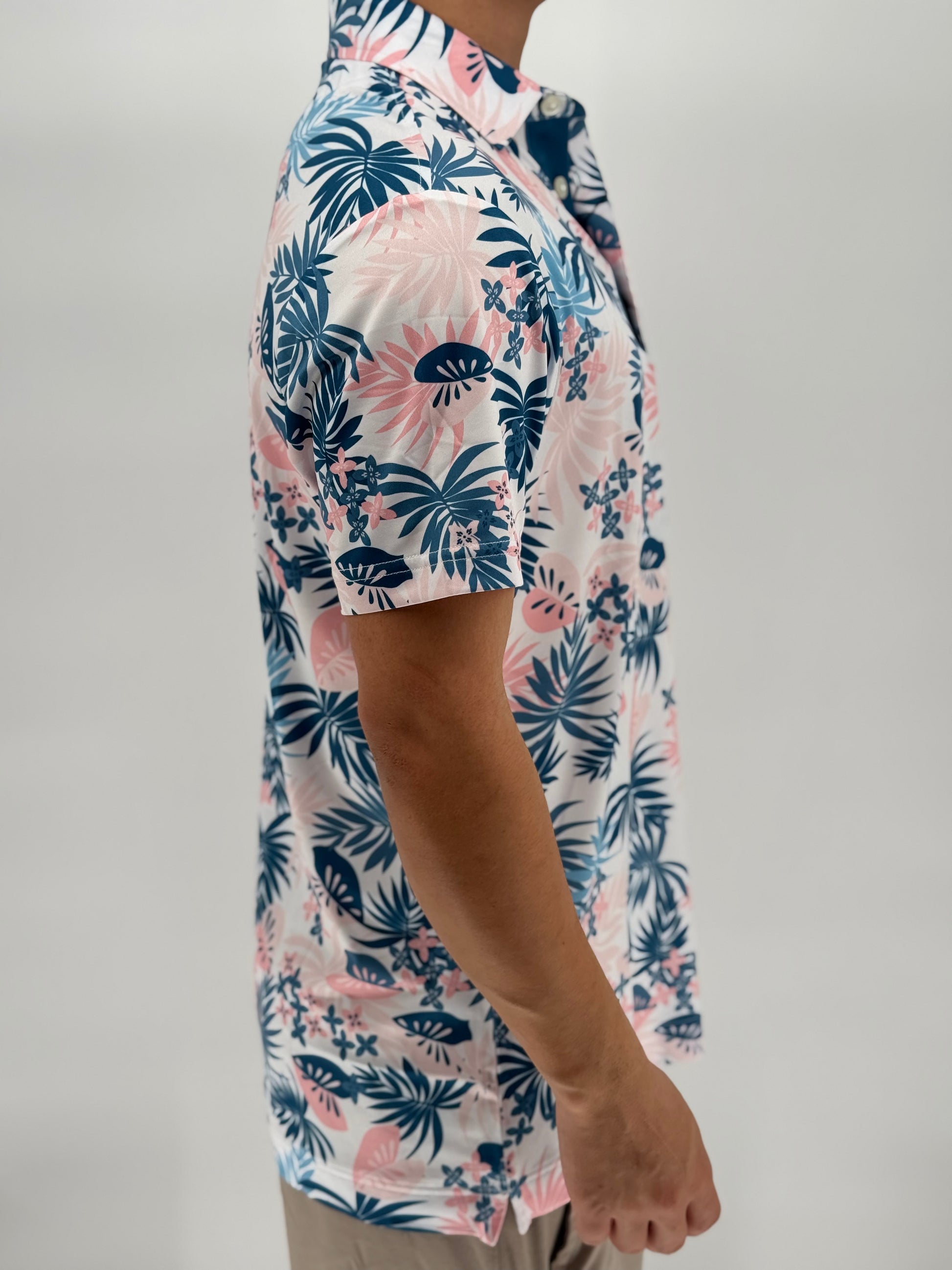 Tropical Fade brings island energy to the fairway with a laid-back blend of pink and blue leaves floating across a clean canvas. It’s equal parts vacay and violence off the tee. Whether you're chasing birdies or just chasing a vibe, this polo is your go-to for effortless flex.